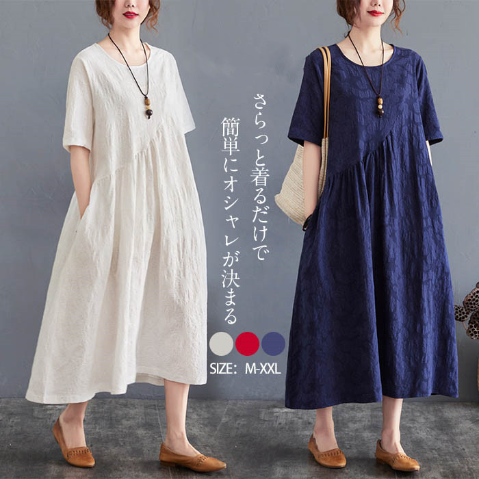 フレア ワンピース 半袖 カジュアル ワンピース ロング ロングワンピース レディース 綿麻混風 大きいサイズ 体型カバー フレアワンピース