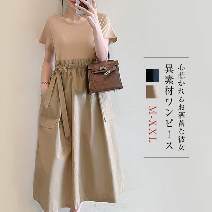 異素材ワンピース 半袖 ドッキングワンピース ロング ワンピース きれいめ ワンピース 春 夏 aライン ワンピース ハイウエスト レディース