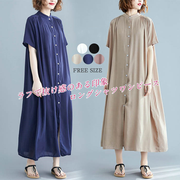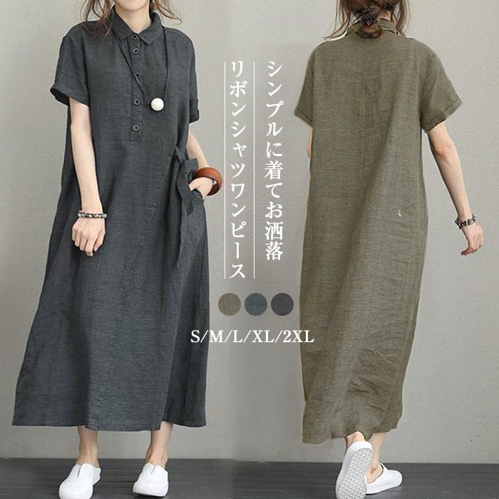 シャツワンピース レディース ロング丈ワンピース シャツ ワンピース ロングワンピース シャツ ワンピース 綿麻調 Aライン ワンピース 半袖 ゆったり