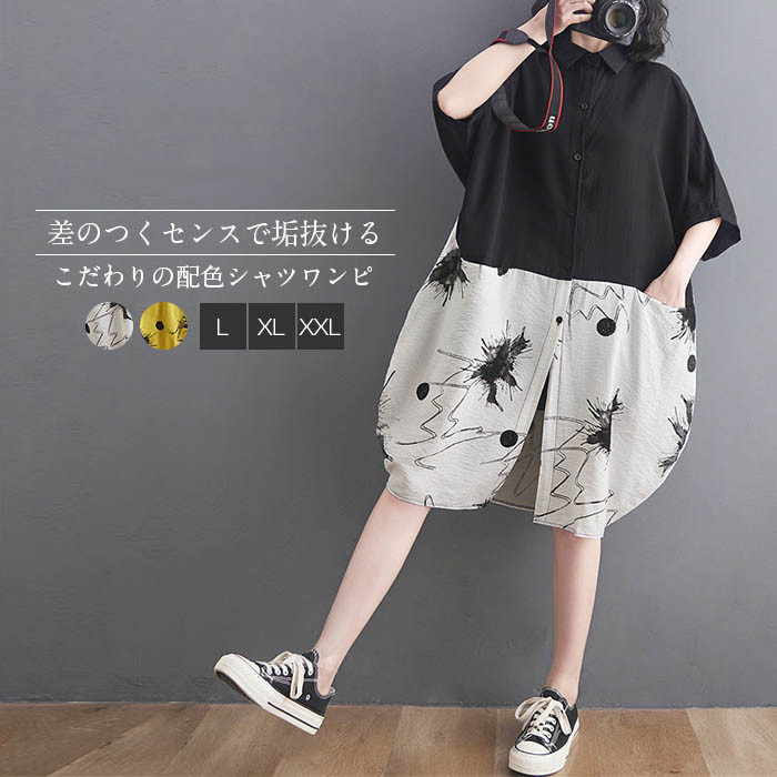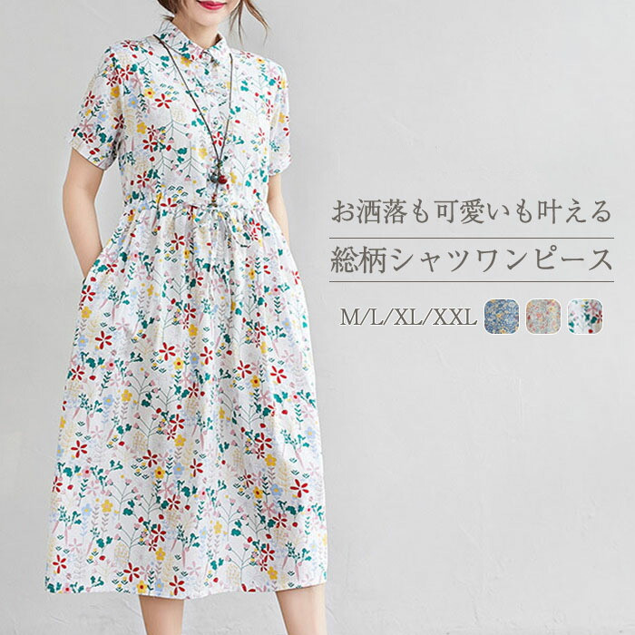 総柄 シャツワンピース レディース 花柄 ロングワンピース シャツ ワンピース 綿麻調 Aライン ワンピース 半袖 ミモレ丈 ドッキングワンピース