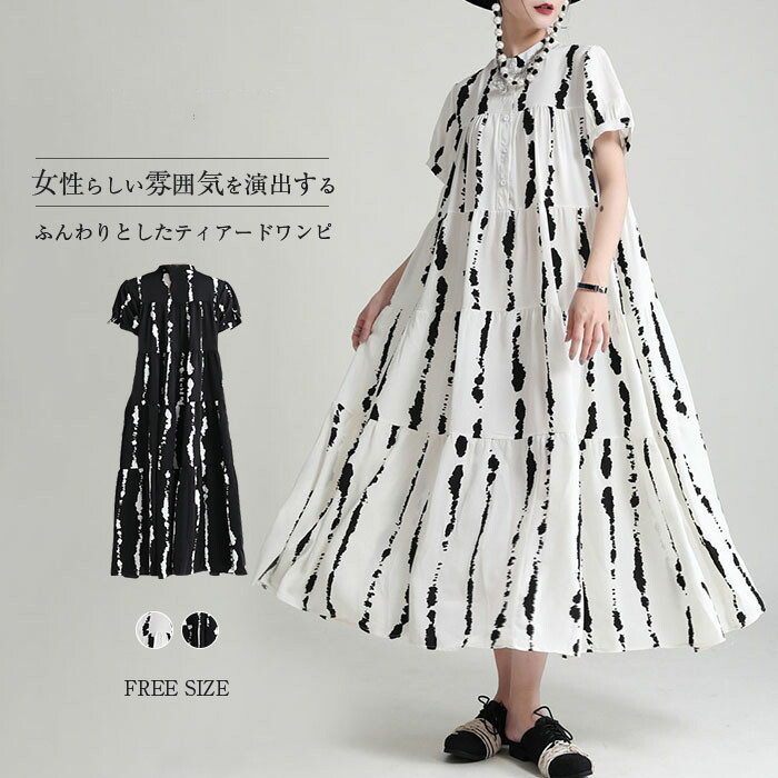 シャツワンピース ティアードワンピース シャツ ワンピース 半袖 ロングワンピース ライン ワンピース 夏 ロング フレアワンピース 切り替え ギャザー