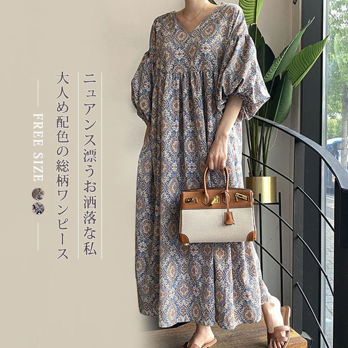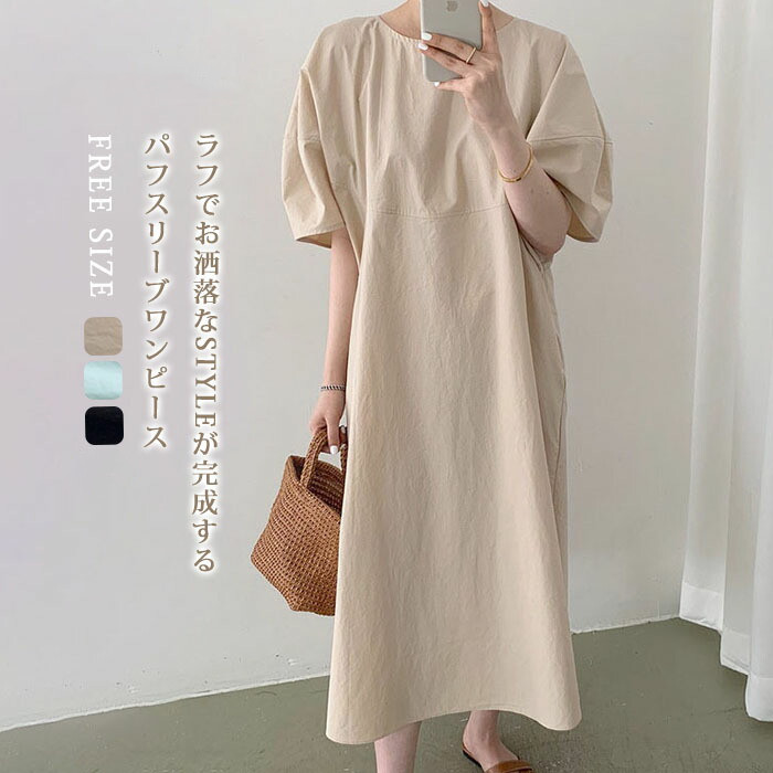 パフスリーブ ワンピースロング夏レディースロングワンピース無地ゆったり大きいサイズシンプル可愛い通勤
