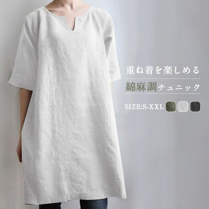 チュニック半袖ロング丈ロングチュニックチュニックワンピース綿麻調ワンピース膝丈ミディアム夏レディース大きいサイズ