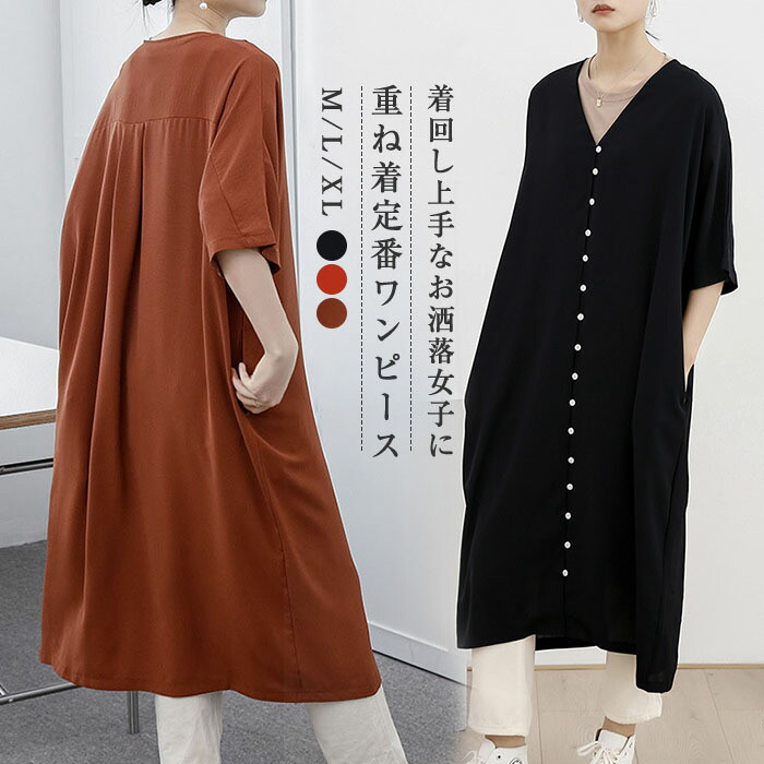 ワンピースVネックロングワンピースレディースロング丈ワンピースワンピ羽織りレイヤードワンピース半袖ボタン