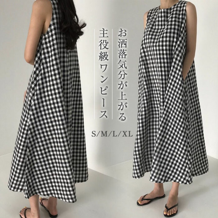 aライン ワンピース レディース ロングワンピース 綿麻調 ロングワンピ チェック ワンピース ノースリーブ タンク フレアワンピース タンクトップワンピース