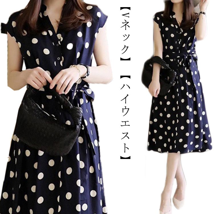 ロングワンピース レディース ドット柄 Aライン 膝丈 ベルト付き シャツワンピースレディースファッション ワンピース