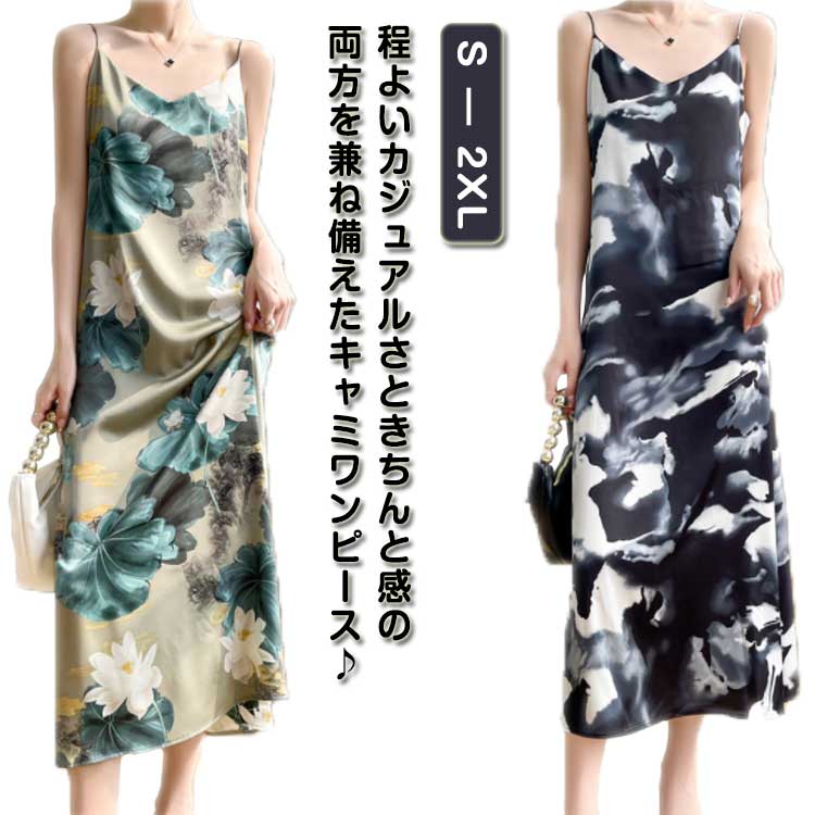 ワンピース 丈 キャミソールワンピース キャミワンピ ワンピ ロング サテン シルク マキシ ロングワンピース シルクキャミ 柄 花柄 総柄 絹 光沢感