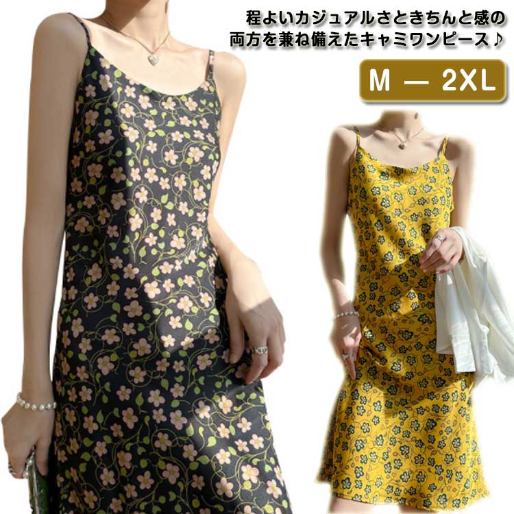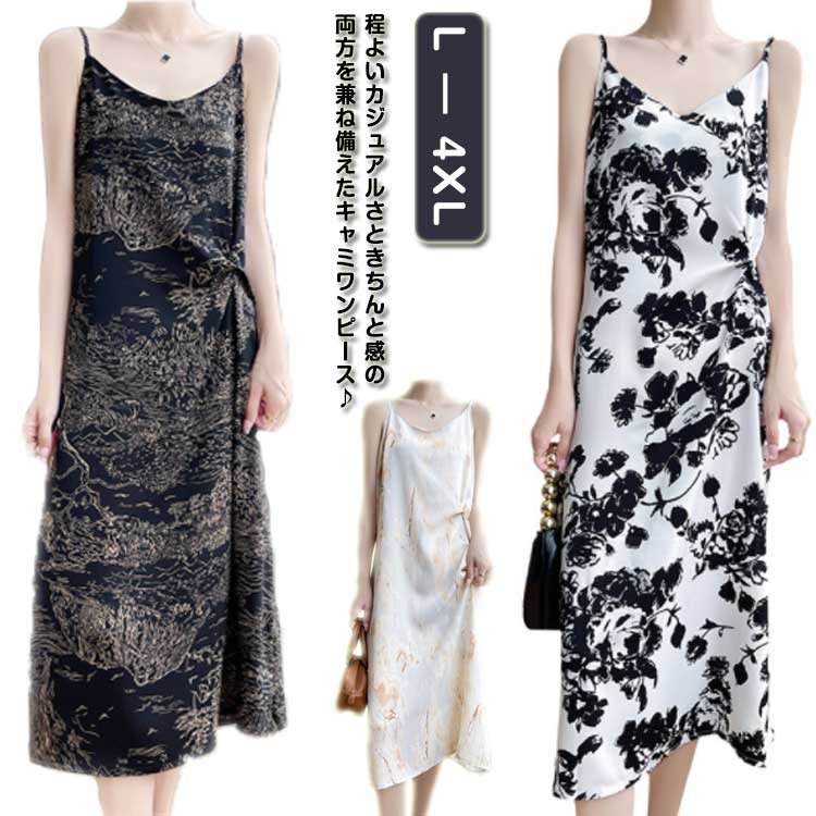 キャミワンピ 丈 ワンピース シルクキャミ キャミワンピース 花柄 ロング マキシ 絹 ワンピ キャミソールワンピース 柄 サテン 総柄 サテン 光沢感
