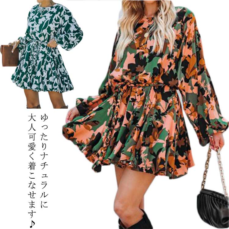シャツワンピース 長袖 ロング ワンピース レディース フレアワンピース 花柄 総柄 シャツワンピ シャツ リボンベルト きれいめ プリール