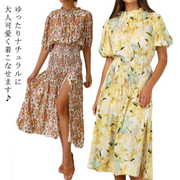 花柄 ワンピース ロング 夏 半袖 ネック フレア ロングワンピース ビーチウェアレディースファッション ワンピース