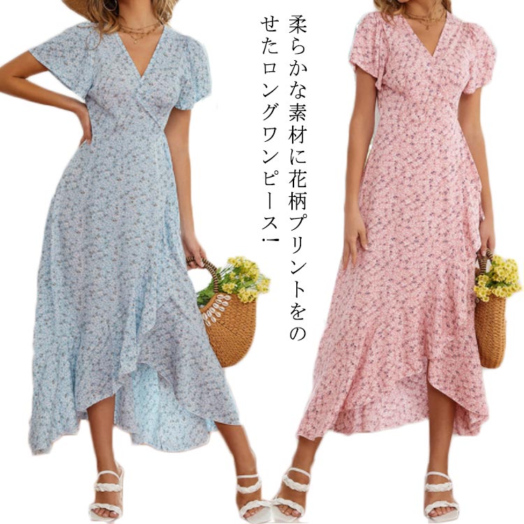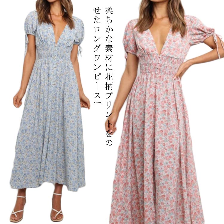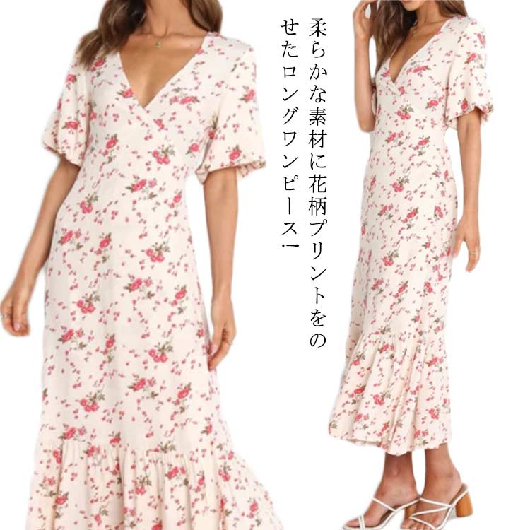 花柄 ワンピース ロング 夏 半袖 vネック フレア ロングワンピース ビーチウェアレディースファッション ワンピース
