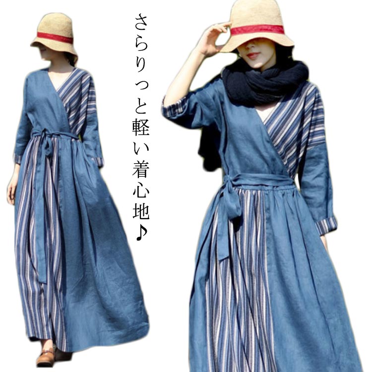 リネン ワンピース 長袖 フレア デニム ライン ロング 体型カバーレディースファッション ワンピース