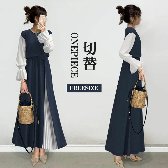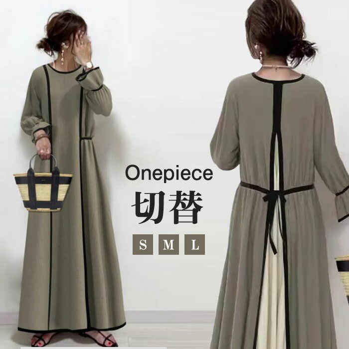 着回しやすい可愛いデザイン♪ロングワンピース 長袖 S M L 切り替え 小顔 袖口ギャザー フェミニン ロング丈 体型カバー 抜け感