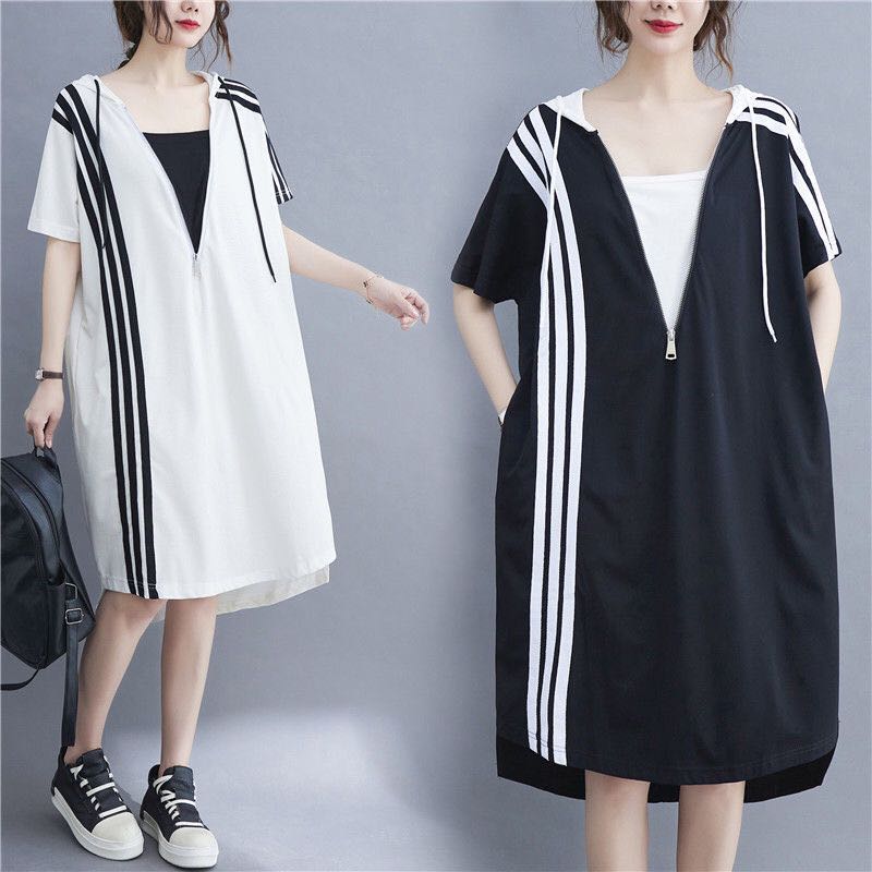 レディース tシャツワンピース サイドライン フード付き ゆったり 半袖 重ね着風 大きいサイズレディースファッション ワンピース