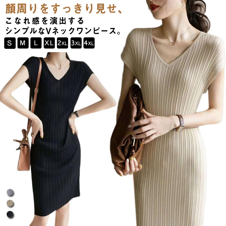 ニットワンピース タイトワンピース 半袖 Vネック 膝丈レディースファッション ワンピース