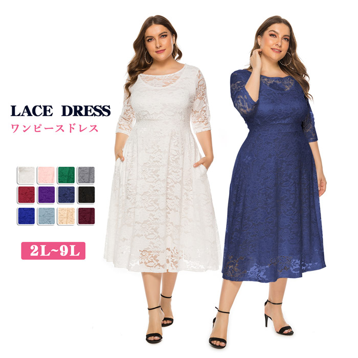 ぽっちゃりドレス 七分袖 レース ワンピース レディース 大きいサイズ 黒 体型カバー 大人 3-9夏 秋