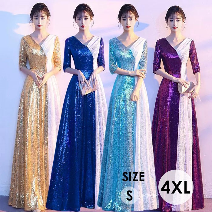 キラキラ ドレス 大人 袖付き ワンピース ピアノ 発表会 ロングドレス オフショルダー 大きいサイズ 小さいサイズ 演奏会 結婚式 母親 大人