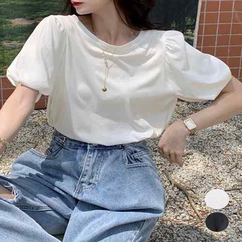 きれいめトップス春夏 シンプルtシャツ ボリューム袖カットソー バルーンスリーブブラウス クルーネックtシャツカジュアル コットントップス白 タックスリーブ夏服 フェミニン服可愛い