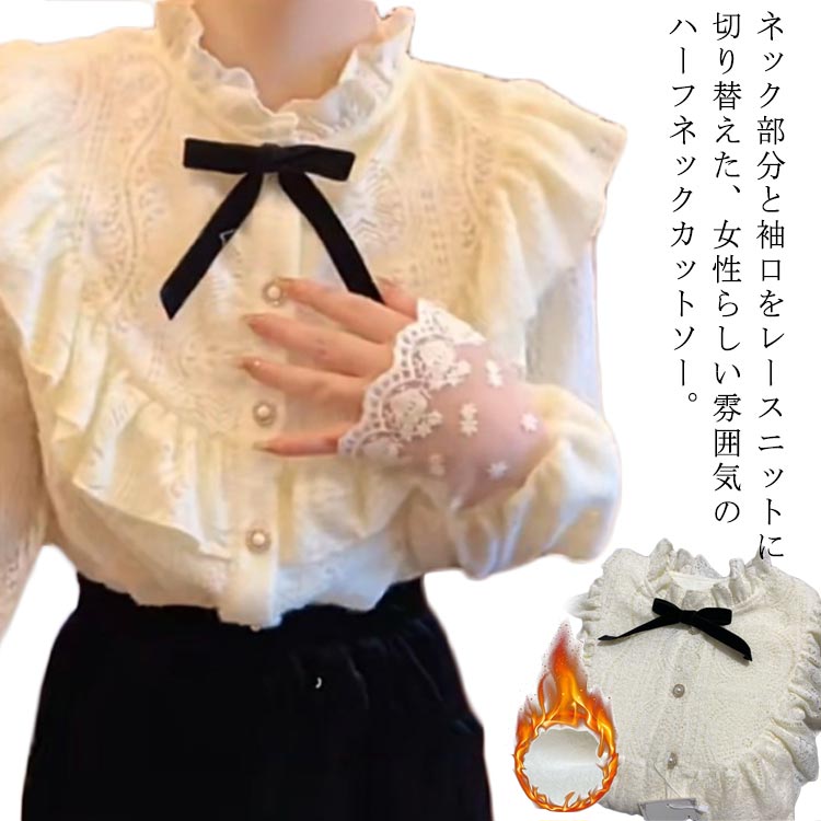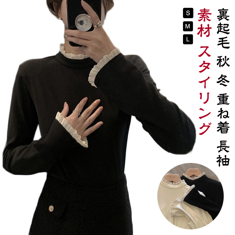 裏起毛の厚手カットソー 裏起毛カットソー レディース トップス インナー フリル ふわふわ もこもこ 暖かい 秋 冬 重ね着 長袖 オフィス 通勤 エレガント