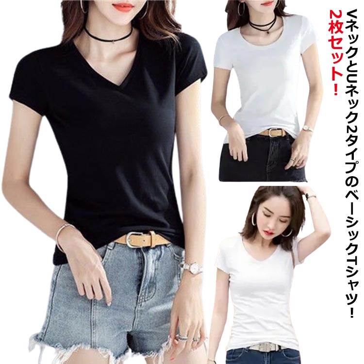 レディース 白 レディース 半袖tシャツ Vネック 丸首 Tシャツ レディース VネックTシャツ 2枚セット 黒 カットソー インナー 半袖