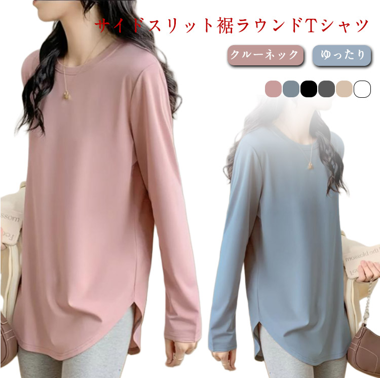長袖 春 Tシャツ クルーネック チュニック カットソー ロンT プルオーバー 無地 レイヤード 裾ラウンド 長め丈 サイドスリット トップス レイヤード 重ね着 薄手 ゆったり 夏 秋 レディース