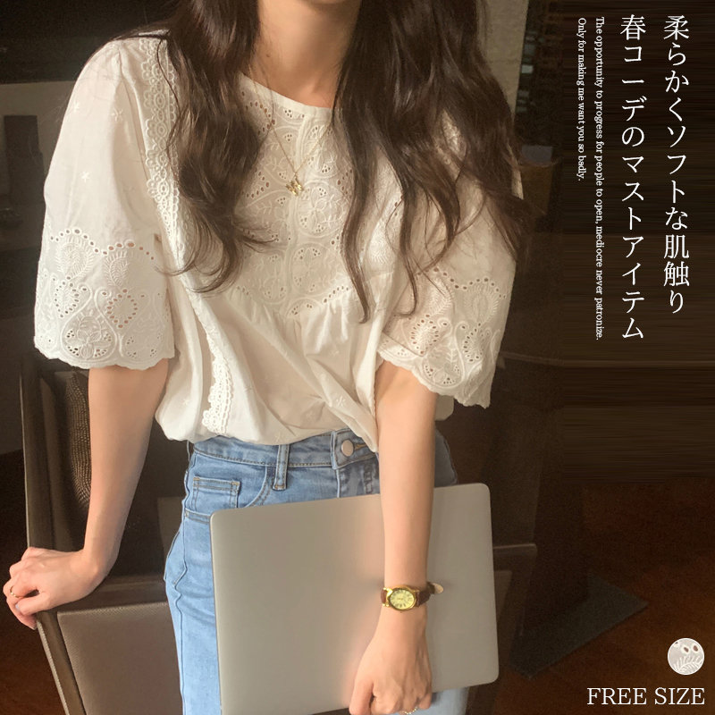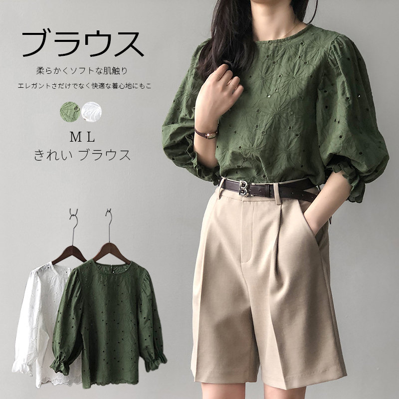 きれいめトップス春夏 シンプルシャツ ボリューム袖カットソー バルーンスリーブブラウス クルーネックシャツカジュアル コットントップス白 タックスリーブ夏服 フェミニン服可愛い