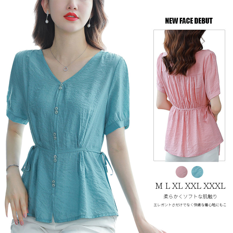 ネックシャツ ブルー半袖トップス お洒落 ピンクシャツ 上品 無地 夏服 夏物 秋 涼しい シャツ 体型カバー サマー リラックス ガーリー トップス Tシャツ ゆったり ファッション Vネッ