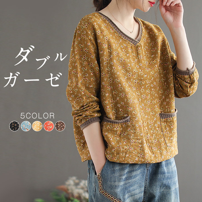 総柄 tシャツ おしゃれ ブラウス コットン レディース トップス 30代 40代 50代 vネック 花柄ブラウス 体型カバー ゆったり長袖 花柄 tシャツブラウス 大きいサイズ