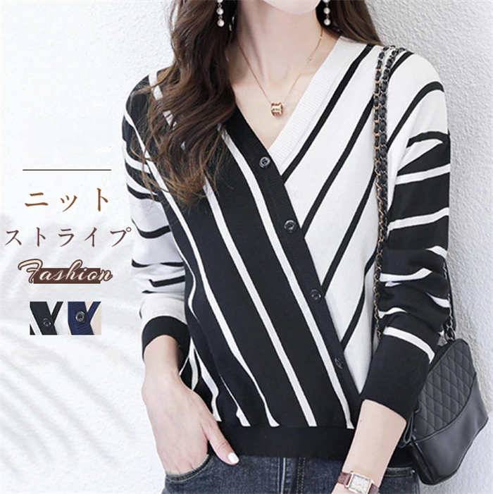 tシャツ レディース 長袖 vネック 春 薄手 tシャツ ニット レディース ストライプ ショート丈 アシンメトリー おしゃれ プルオーバー カットソー ショート 可愛い トップス ゆったり