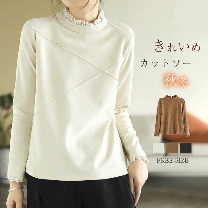 カットソー 長袖 レディース きれいめ 秋 冬 セーター 秋 長袖 ハイネック レース襟 秋冬 暖かい ニットセーター あったか お洒落 トップス プルオーバー おしゃれ 無地 秋冬