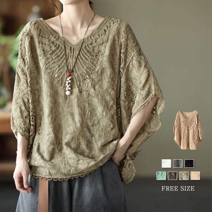 ブラウス レディース 夏 半袖 5分袖 刺繍 総柄 花柄 ドルマンスリーブ フリル トップス ブラウス カジュアル おしゃれ 体型カバー ゆったり 着痩せ
