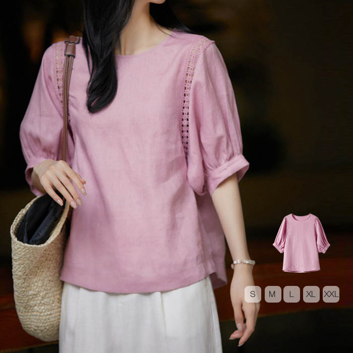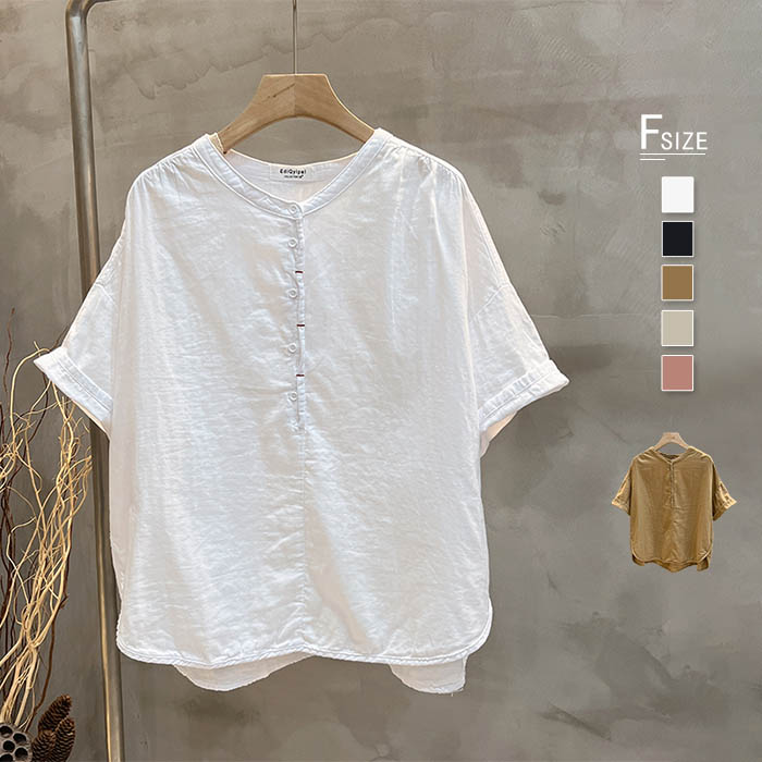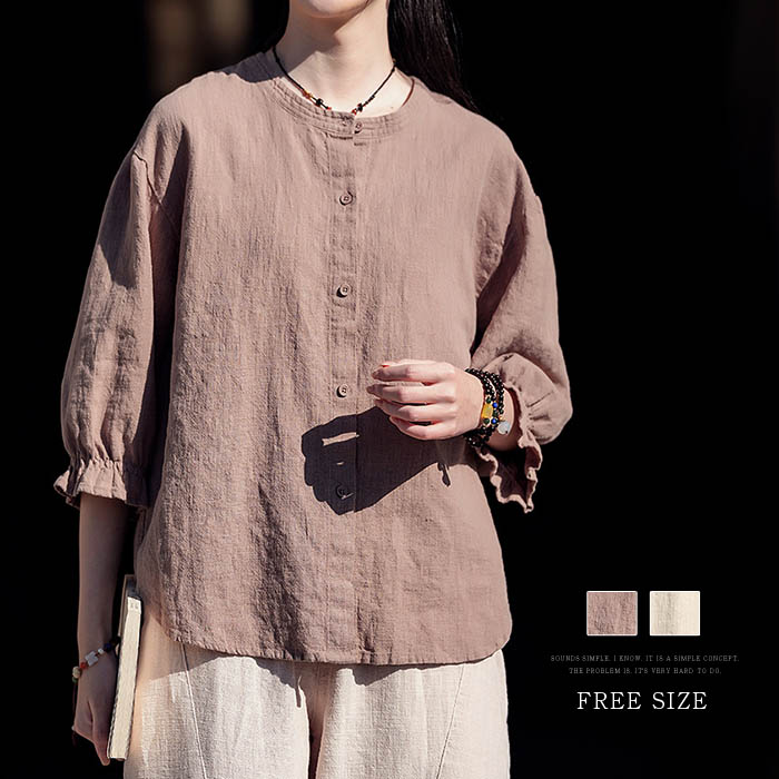 リネン ブラウス レディース 綿麻混 春 夏 秋 半袖 7分袖 バンドカラー 無地 トップス シャツブラウス カジュアル おしゃれ 体型カバー ゆったり