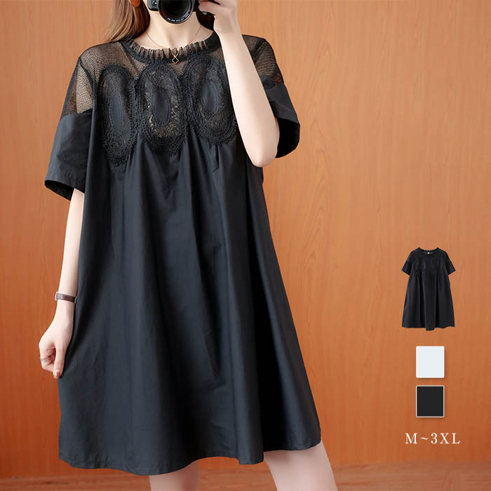 半袖 ブラウス レディース 夏 チュニック ワンピース レース 透け感 ワンピース レース 大きサイズ 半袖 ロングブラウス ロング トップス フレア フレアワンピース