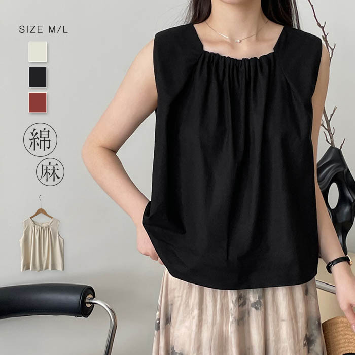 綿麻 ノースリーブ ブラウス レディース 夏 無地 コットン リネン ギャザー ノースリーブ ギャザーブラウス トップス ノースリーブブラウス カジュアル おしゃれ