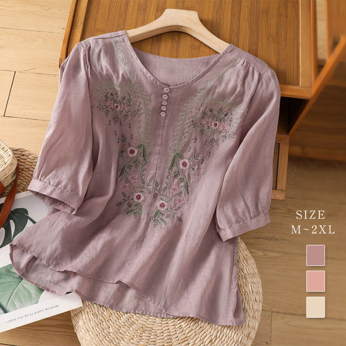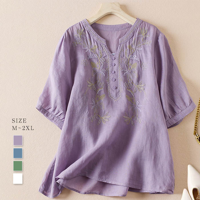 ブラウス レディース 夏 綿麻風 半袖 切り替え 5分袖 リネン コットン 花柄 刺繍 トップス シャツブラウス カジュアル おしゃれ 体型カバー ゆったり 着痩せ