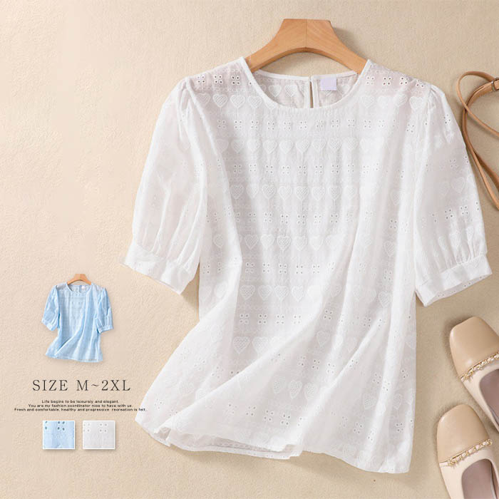 ブラウス レディース 夏 綿 半袖 切り替え キーネック コットン 花柄 刺繍 トップス シャツブラウス カジュアル おしゃれ 体型カバー ゆったり 着痩せ