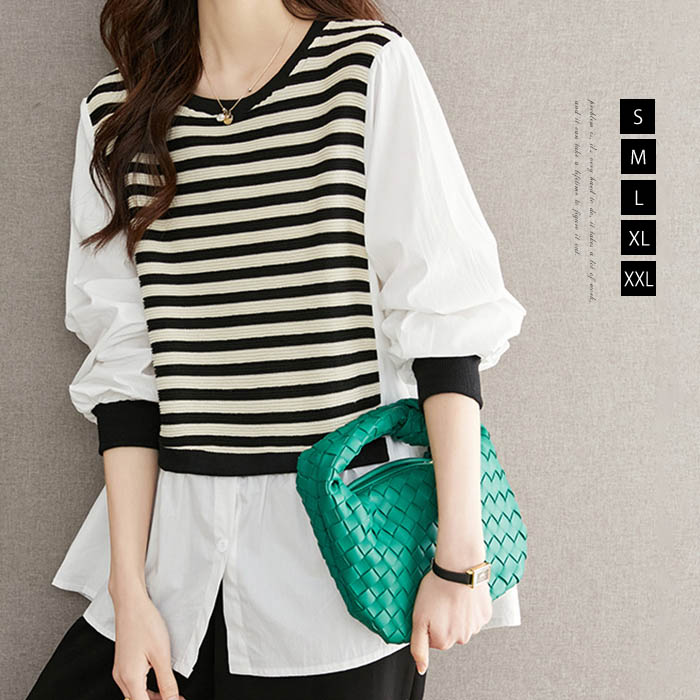 ブラウス レディース 春 夏 秋 長袖 切り替え ストライプ トップス 異素材 シャツブラウス カジュアル おしゃれ 体型カバー ゆったり 着痩せ 着心地