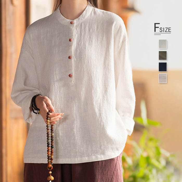 リネン ブラウス レディース 綿麻混 春 夏 秋 長袖 バンドカラー 無地 トップス シャツブラウス カジュアル おしゃれ 体型カバー ゆったり ナチュラル
