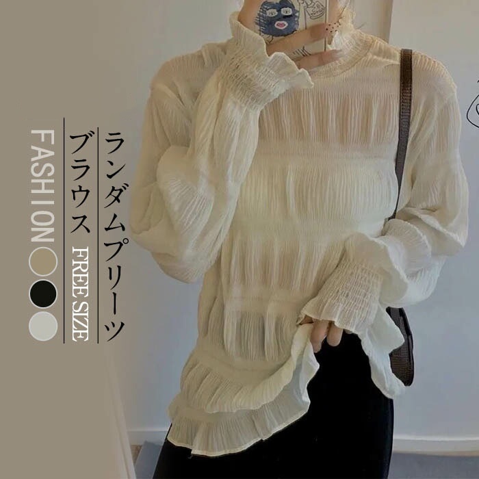 ブラウス シャツ レディース 長袖 春 トップス シフォン インナー フリルネック フリル袖口 ランダムプリーツ ハイネック ミドル丈