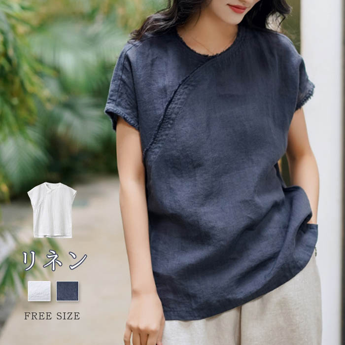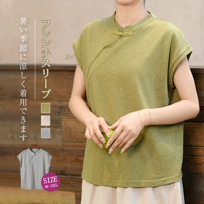 シャツ レディース コットン 夏 綿麻 チャイナボタンフレンチスリーブ カットソー コットン リネン シャツ トップス 半袖トップス