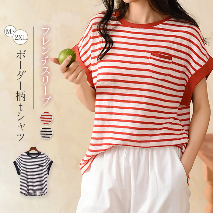 ボーダー tシャツ レディース フレンチスリーブ 半袖 ゆったり カジュアル 夏 クルーネック 春夏 薄手 ボーダー柄 きれいめ Tシャツ レディース 綿100%