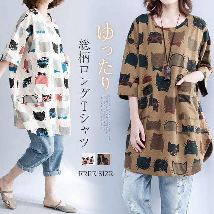 tシャツ ロング丈 カットソー レディース ロングtシャツ 半袖 総柄 かわいい チュニック 夏 7分袖 ロング ゆったり トップス プルオーバー
