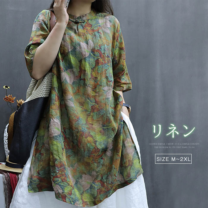 リネン ブラウス レディース 夏 5分袖 半袖 チュニック ワンピース チャイナボタン シャツワンピース スリット 麻 スタンドカラー 半袖