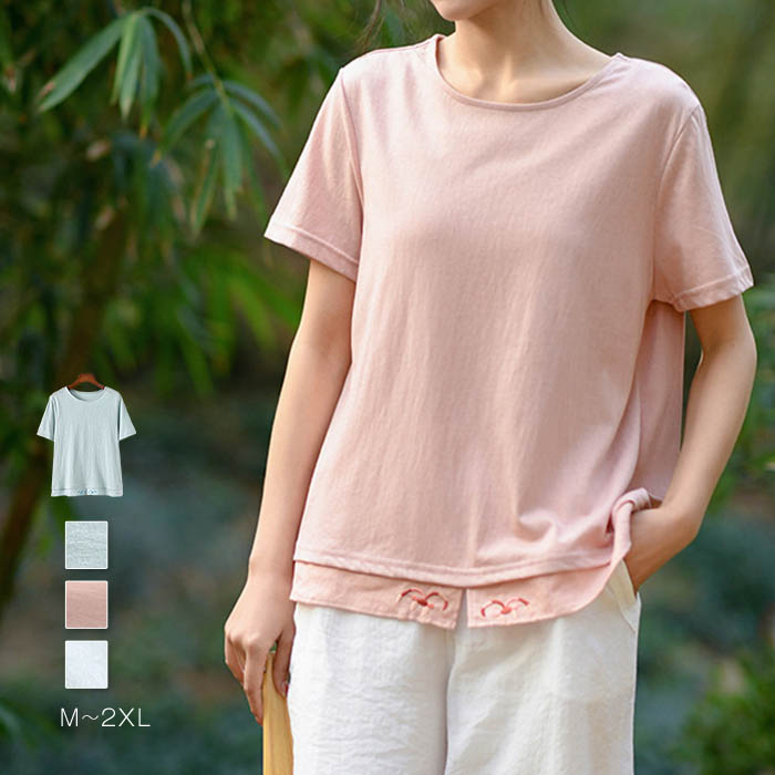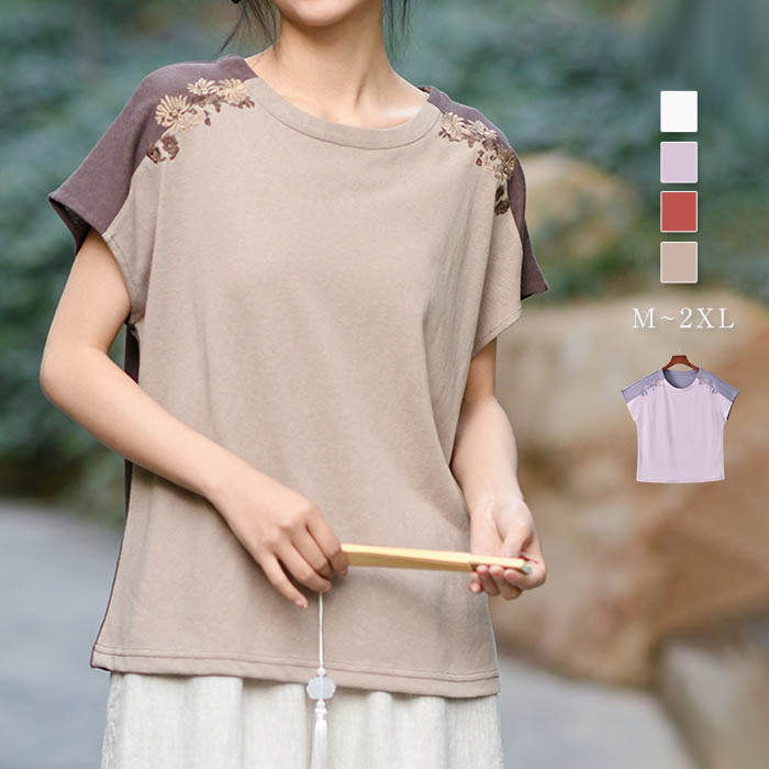 tシャツ レディース 夏 綿麻風 コットン リネン 麻 半袖 配色 切り替え 半袖tシャツ 刺繍 花柄 トップス Tシャツ カジュアル おしゃれ 体型カバー ゆったり