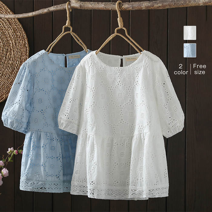 綿 ブラウス レディース 夏 半袖 刺繍 綿 5分袖 コットン 総柄 切り替え 刺繍 トップス ブラウス カジュアル おしゃれ 体型カバー ゆったり 着痩せ 着心地