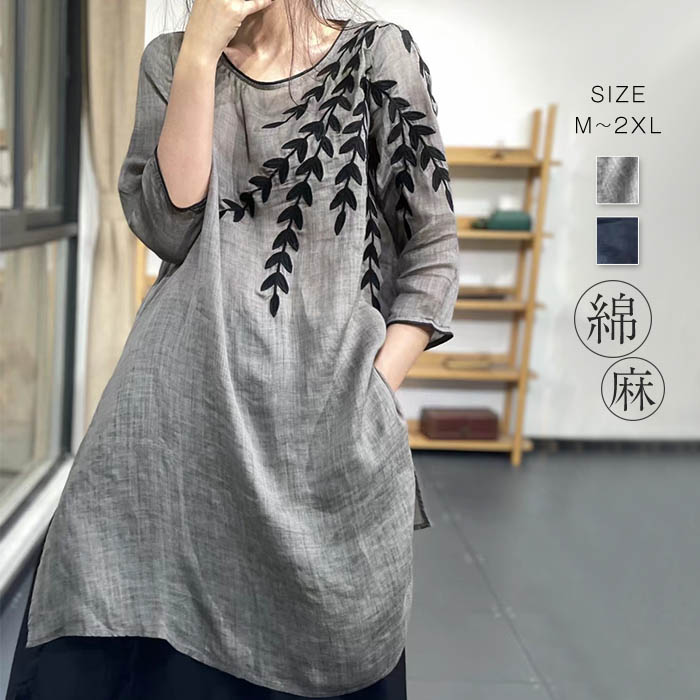 シャツ レディース 夏 綿 コットン 半袖 スリット 切り替え 半袖シャツ 刺繍 トップス シャツ カジュアル おしゃれ 体型カバー ゆったり 着痩せ