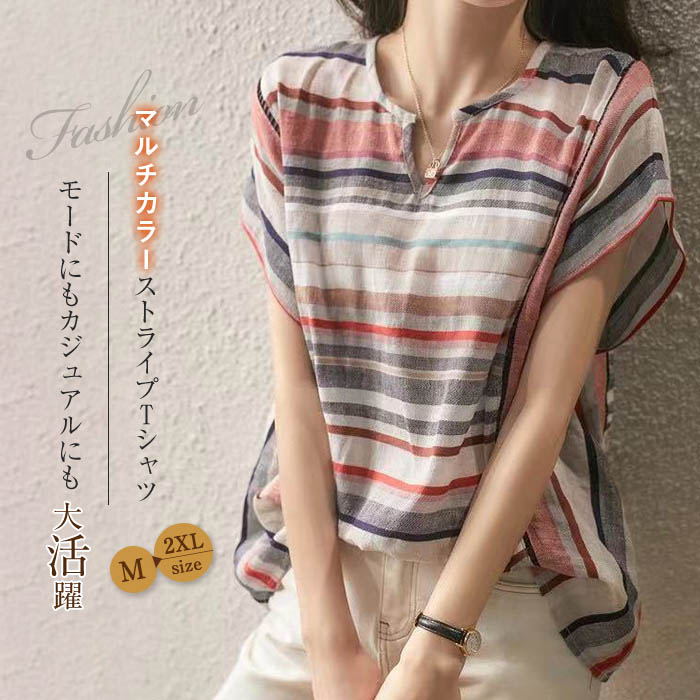 tシャツ レディース 夏 ストライプ 半袖tシャツ トップス Tシャツ カットソー 半袖 春夏 総柄 配色 カジュアル トレンド おしゃれ 涼しい 薄手