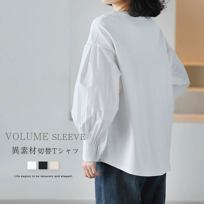 ボリューム スリーブ 長袖 tシャツ レディース 春 秋 コットン トップス 綿混 スウェット カットソー 長袖トップス 異素材 切り替え 無地 シンプル クルーネック ゆったり
