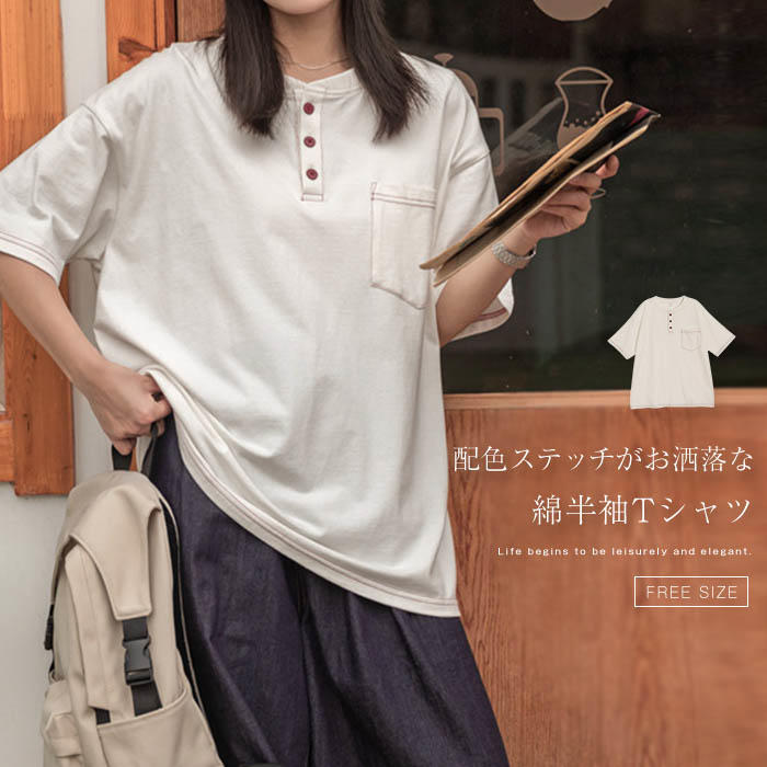 綿 tシャツ レディース 半袖 夏 tシャツ 無地 白 ホワイト 半袖tシャツ カットソー プルオーバー トップス コットン カットソー ポケット付き ボタン ゆったり シンプル カジュアル