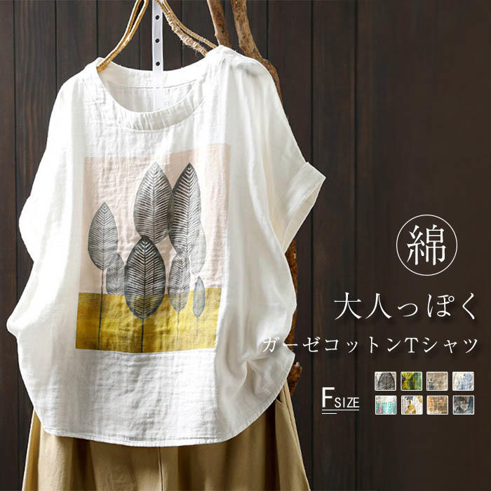コットン100% ガーゼ tシャツ レディース 半袖 ダブルガーゼ コットン 綿 柄 花柄 プリント Tシャツ プルオーバー クルーネック 柔らかい 柔軟 ゆったり 大きいサイズ 大人